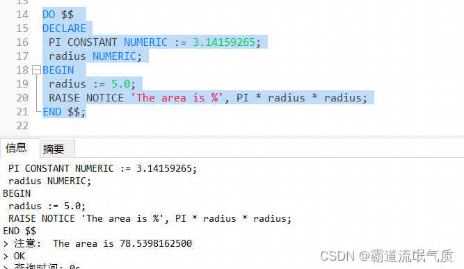 RAISE NOTICE 'The area is %', PI * radius * radius;
