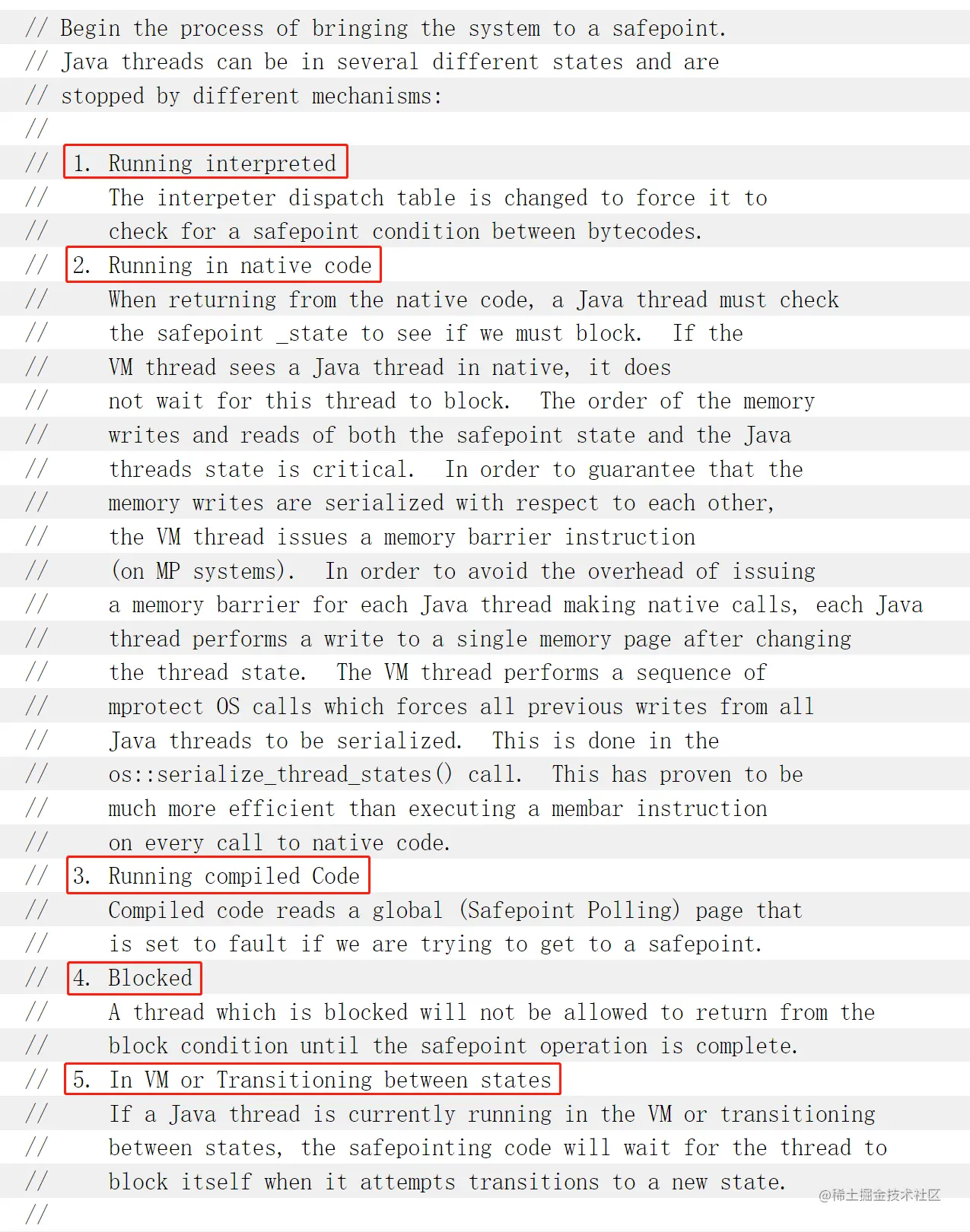 注释里面说,在程序进入 Safepoint 的时候, Java 线程可能正处于框起来的五种不同的状态,针对不同的状态有不同的处理方案。