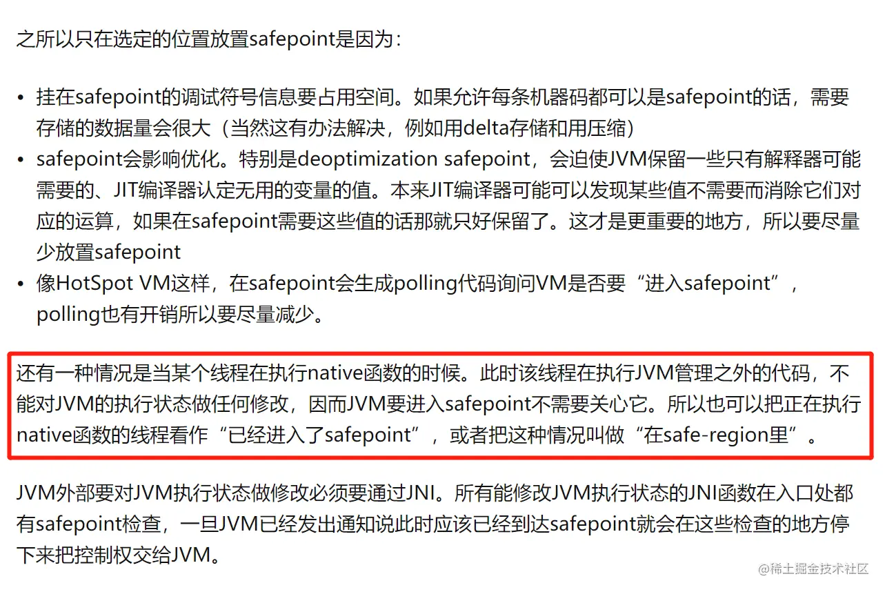 第一句话,就是答案,意思就是一个线程在运行 native 方法后,返回到 Java 线程后,必须进行一次 safepoint 的检测。