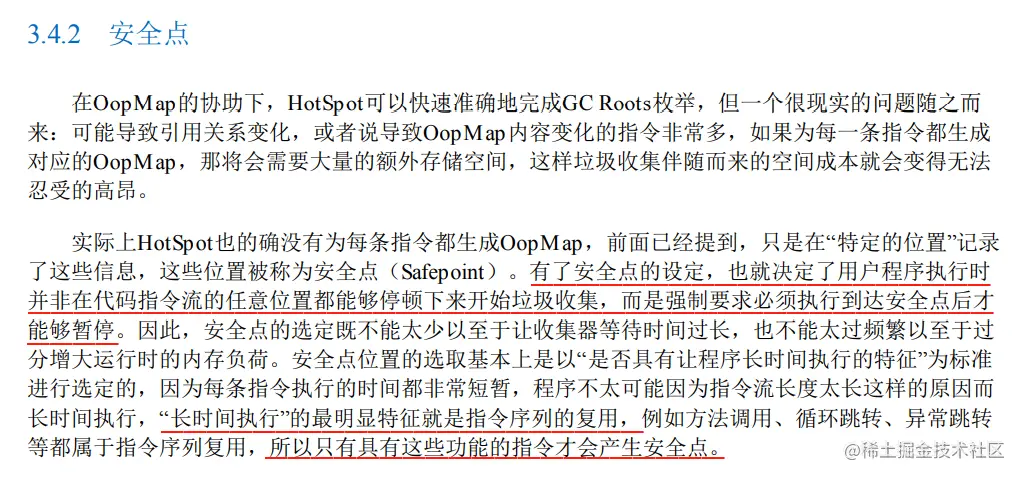 关于安全点的描述,我们可以看看《深入理解JVM虚拟机(第三版)》的 3.4.2 小节: