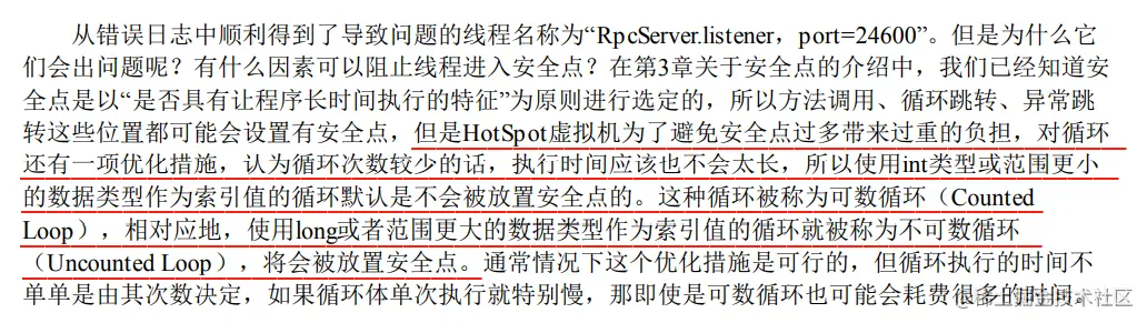 意思就是在可数循环(Counted Loop)的情况下,HotSpot 虚拟机搞了一个优化,就是等循环结束之后,线程才会进入安全点。