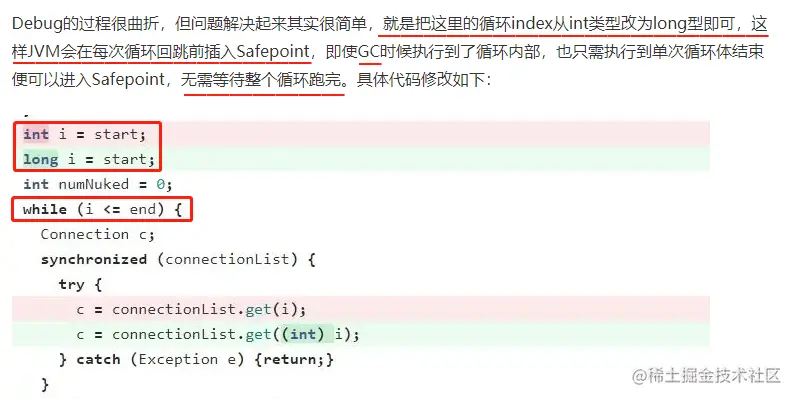 这样,即使 for 循环的对象是 int 类型,也可以按照预期执行。因为我们相当于在循环体中插入了 Safepoint。