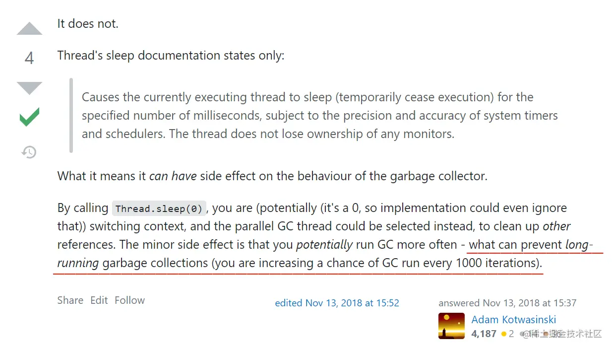 这个的回答说:通过调用 Thread.sleep(0) 的目的是为了让 GC 线程有机会被操作系统选中,从而进行垃圾清理的工作。它的副作用是,可能会更频繁地运行 GC,毕竟你每 1000 次迭代就有一次运行 GC 的机会,但是好处是可以防止长时间的垃圾收集。