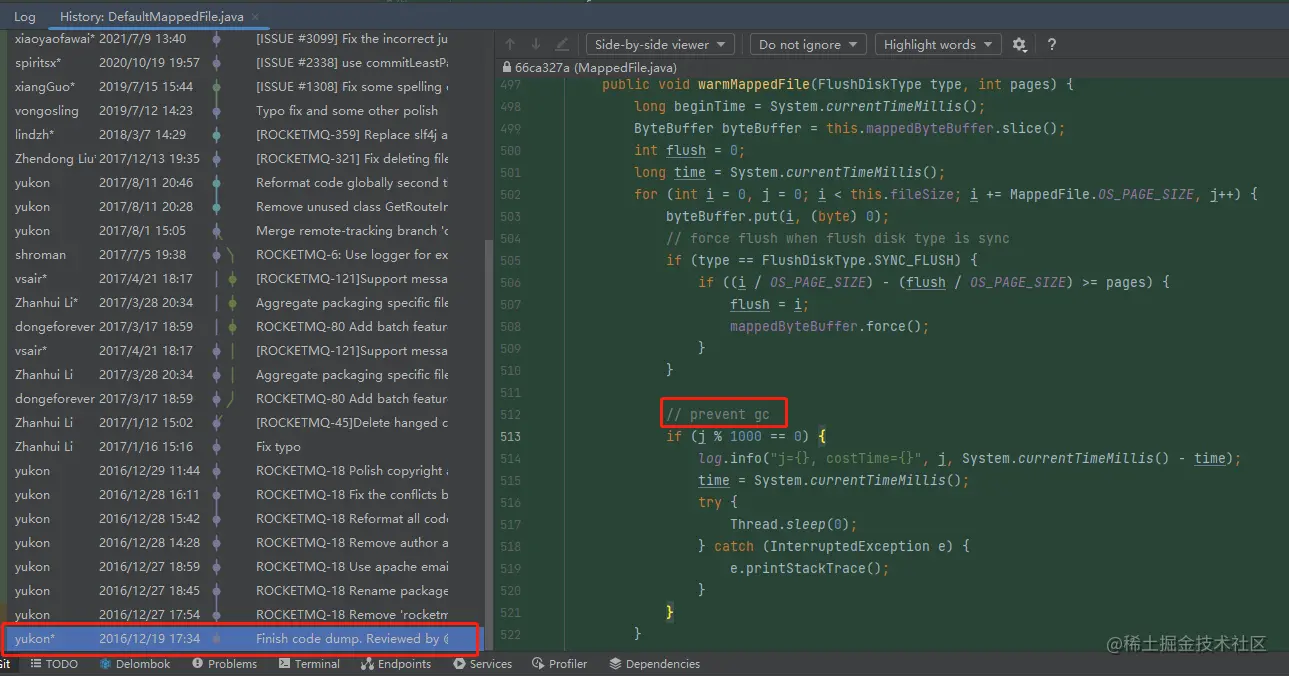 当我知道这个代码片段是属于 RocketMQ 的时候,我想到的第一个点就是从代码提交记录中寻找答案。