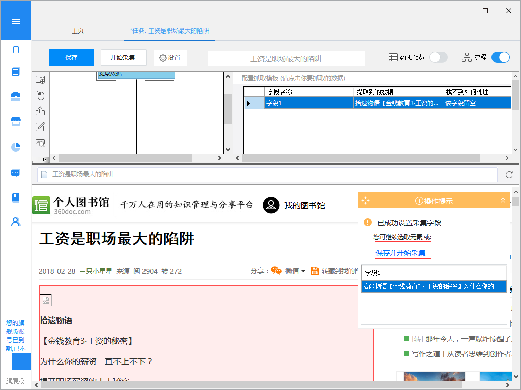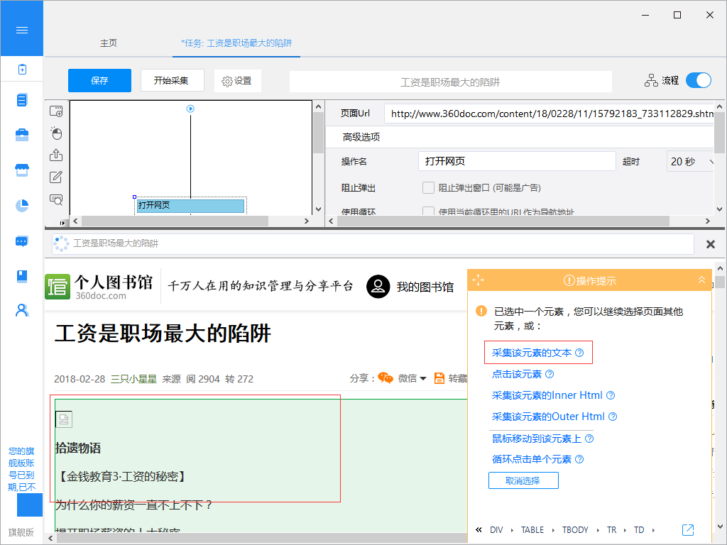 3)然后进入360图书馆文章页,选中要复制的网页文章,在“操作提示”中选择“采集该元素的文本”