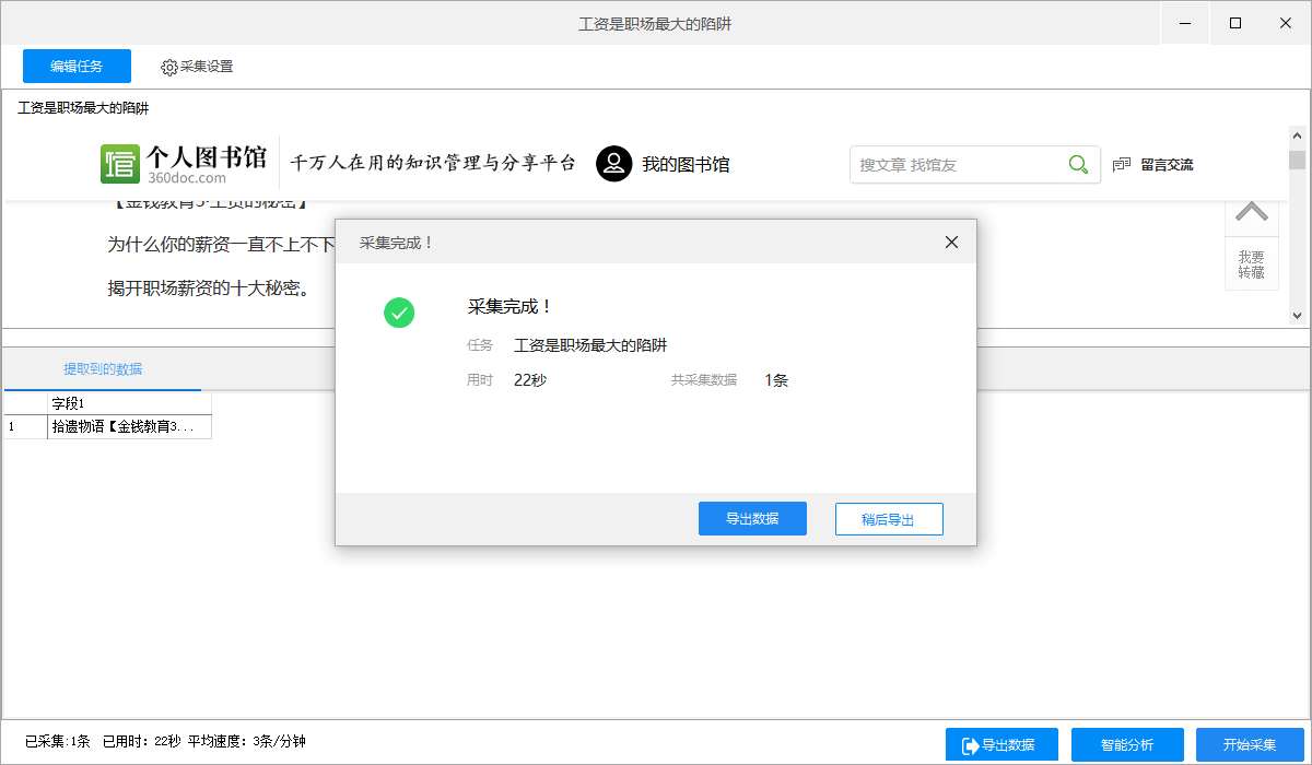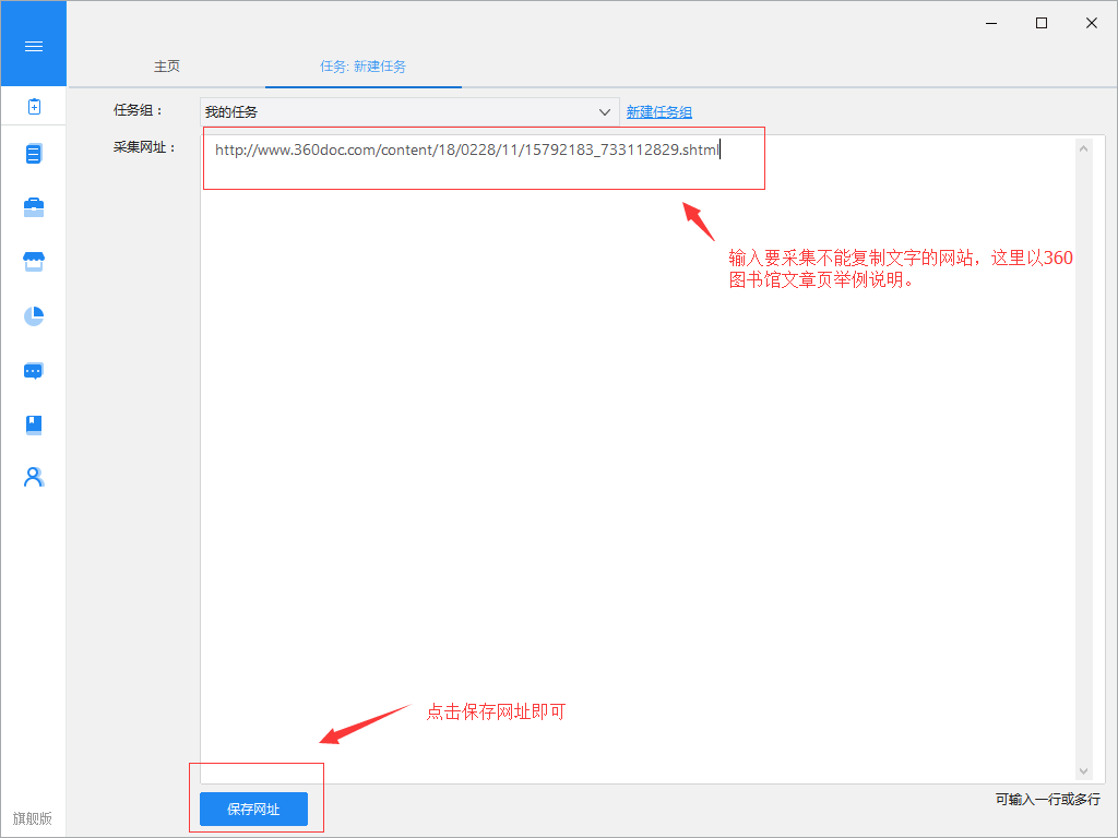 2)将要采集的不能复制文字的网站URL复制粘贴到网站输入框中,这里以360图书馆文章页举例说明,点击“保存网址”