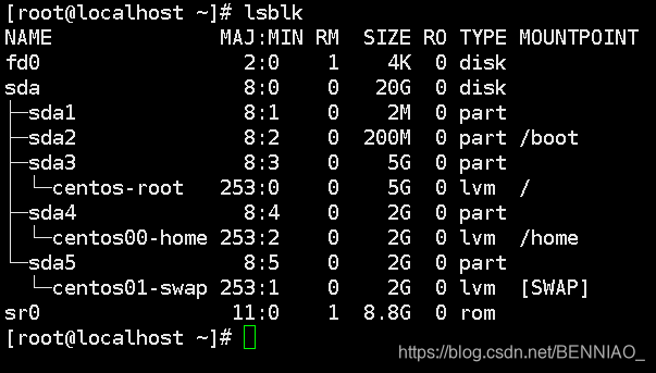 第一步:# lsblk(查看硬盘分区情况以及使用情况)