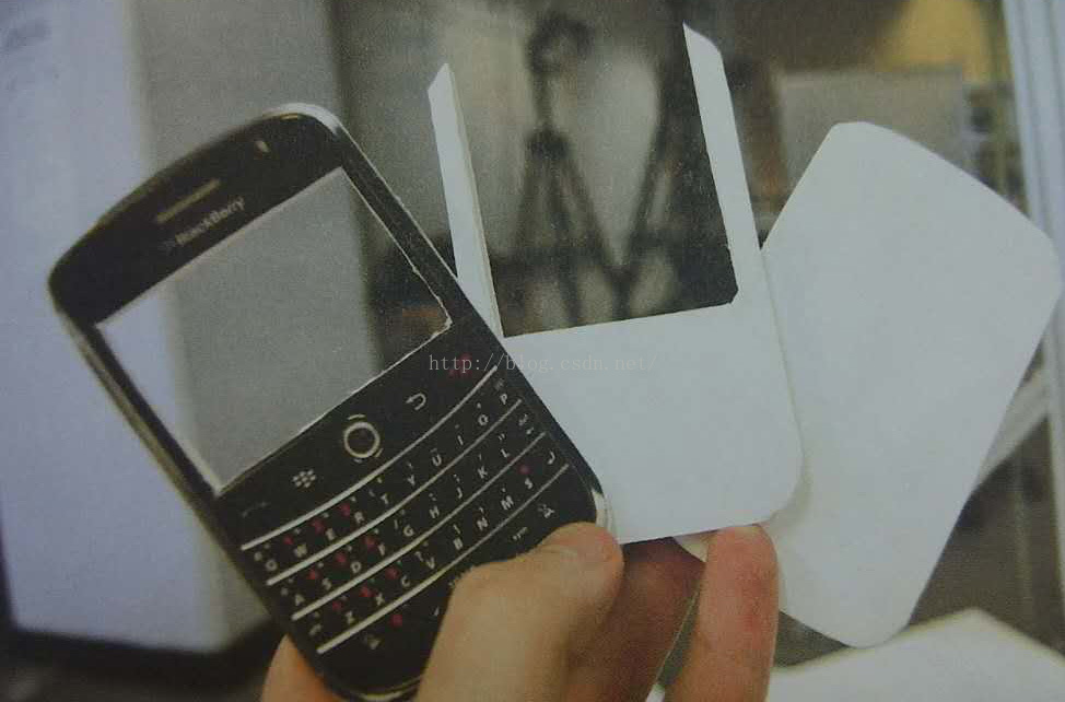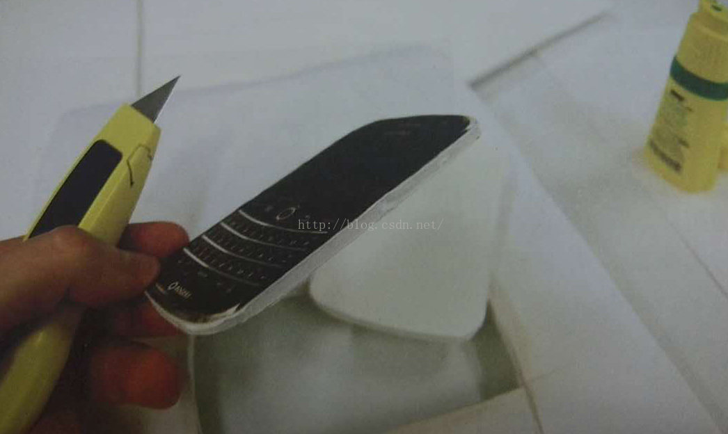 将照片粘到泡沫板上,按设备(手机)轮廓裁下带有照片的泡沫板