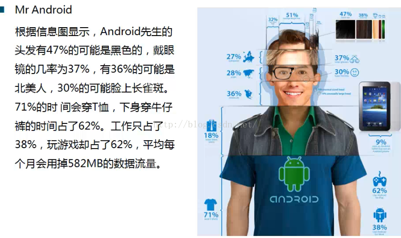 下图也是数据分析的结果展现。信息图,也是数据展现工作的重要组成部分,也会给决策带来好处,现在有一种职位叫做数据可视化工程师。这个图反应的是使用安卓的人的特征。