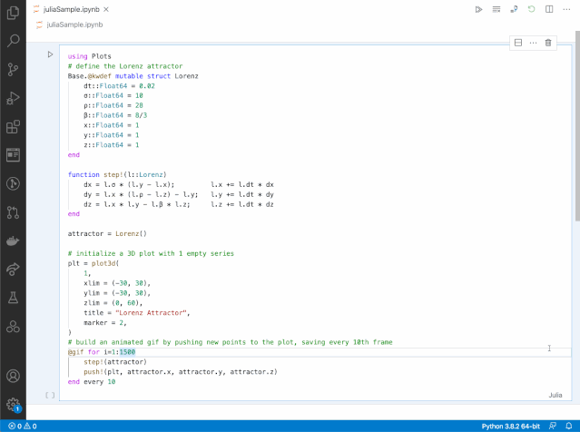 Jupyter插件为现在Jupyter Notebooks支持的编程语言内核提供了基本的Notebook支持,许多编程语言内核无需修改即可使用。下面的屏幕截图显示了使用Jupyter插件名以VS Code查看和运行Julia Notebook。
