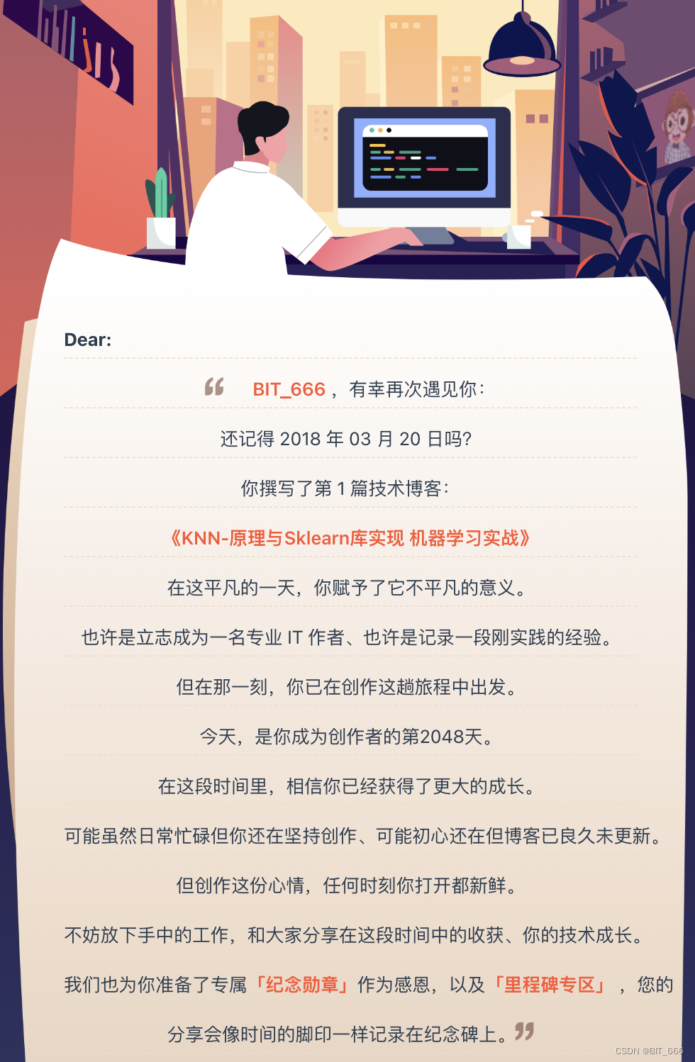今天爬山途中就又收到了 CSDN 的创作 2048 天纪念推送: