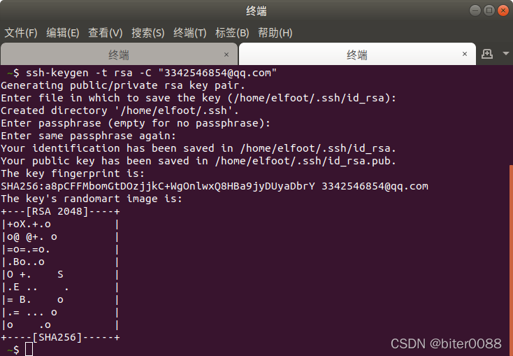 如下面的终端所示,在Enter file in which to save the key (/home/elfoot/.ssh/id_rsa): 行,我按下“enter”键,选择默认文件夹;
