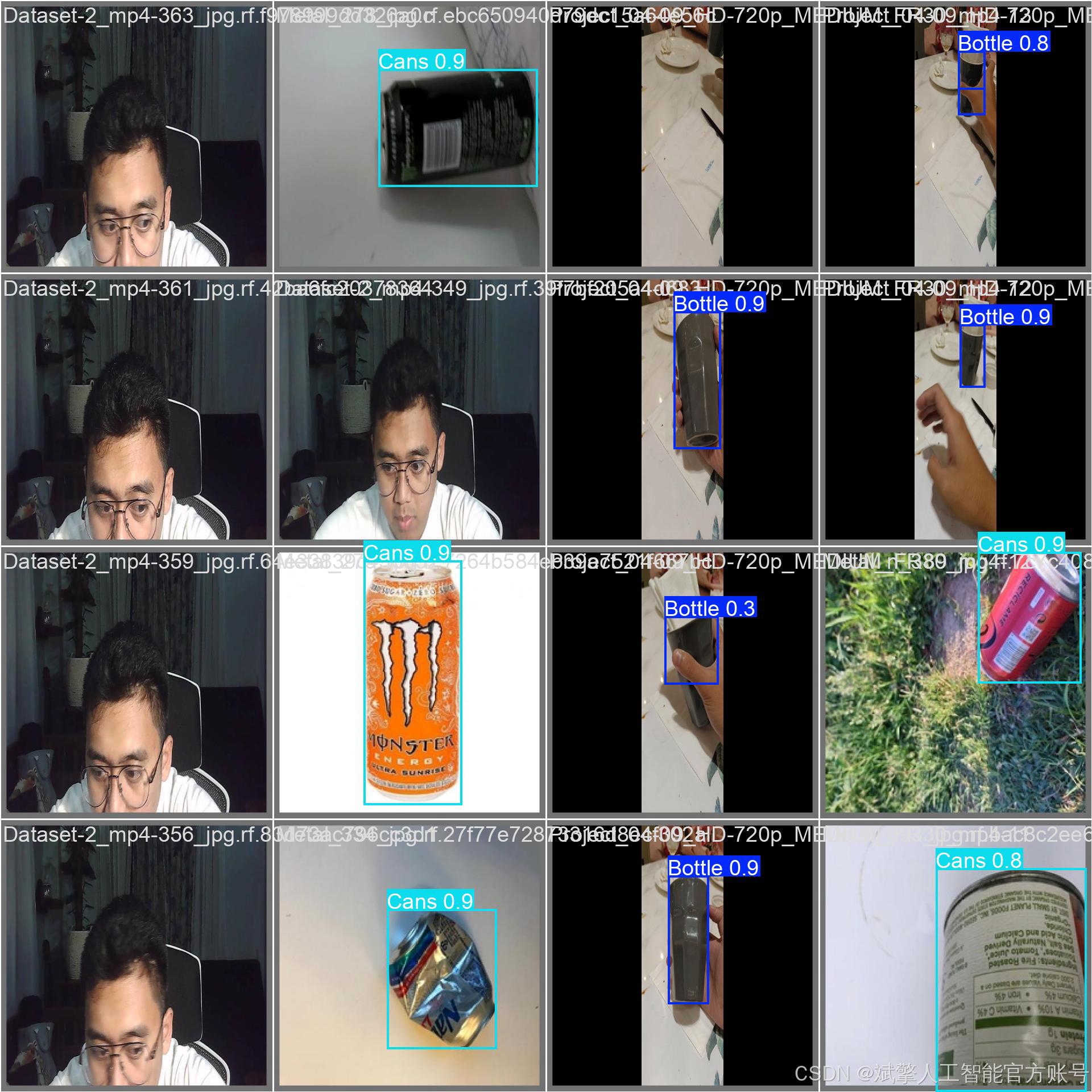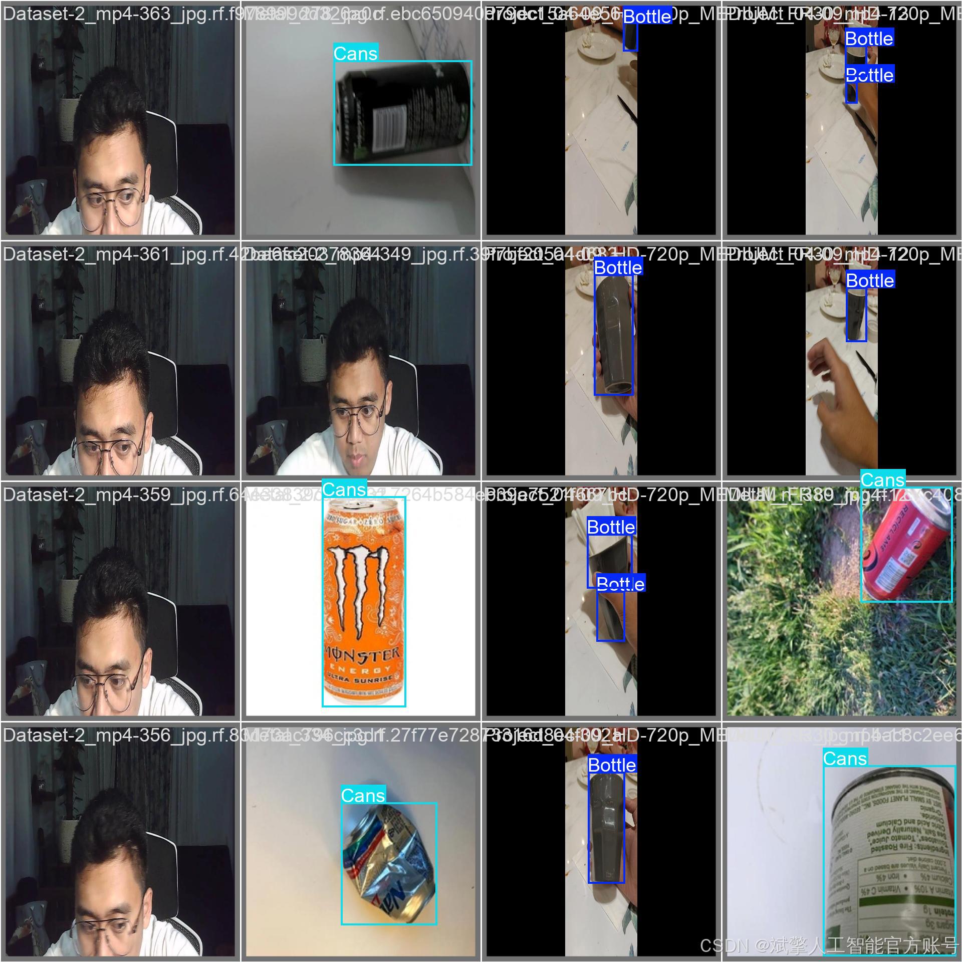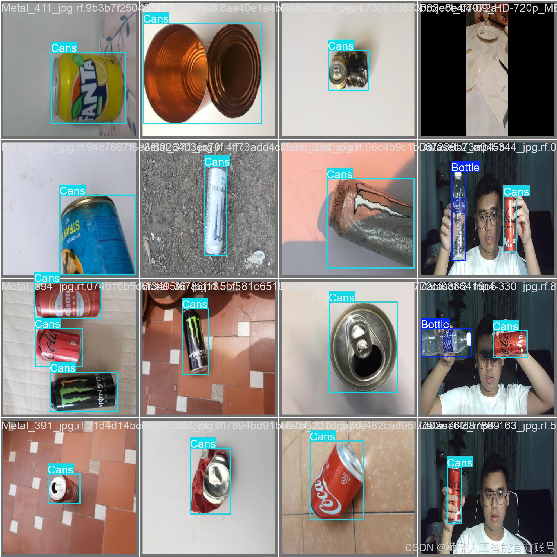 本系统所使用的数据集是一个专门为固体废物识别任务构建的高质量图像数据集。数据集的核心关注点为两类常见的可回收废弃物:‘Bottle’(瓶子) 和 ‘Cans’(罐子)。