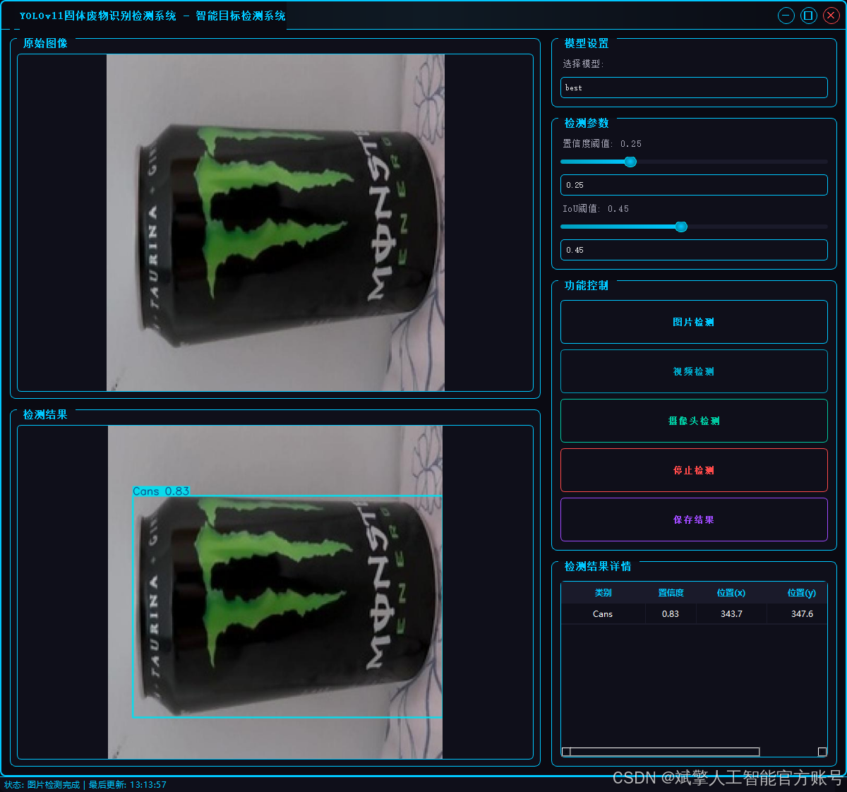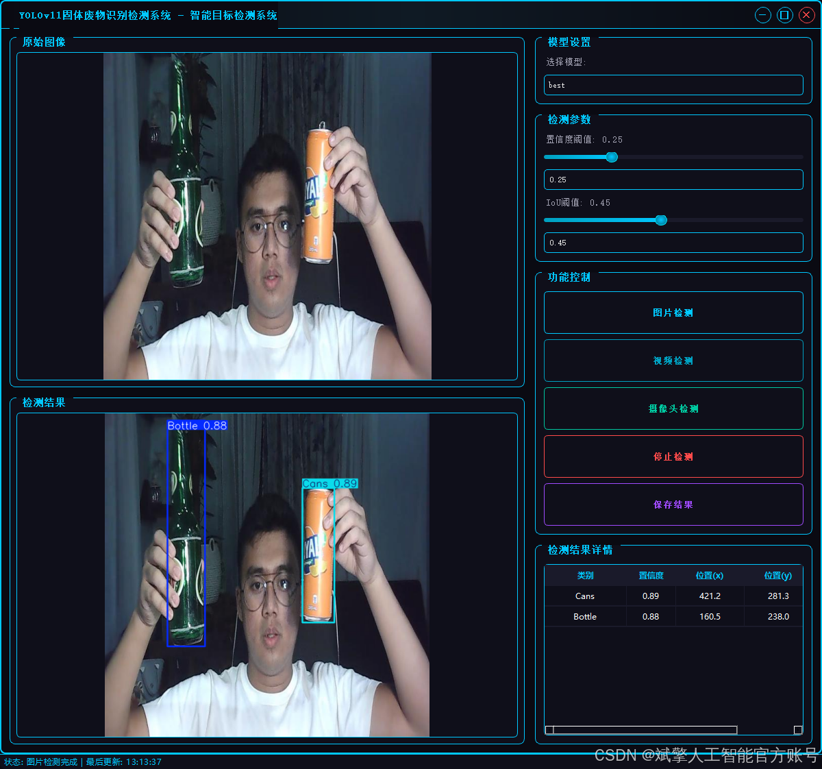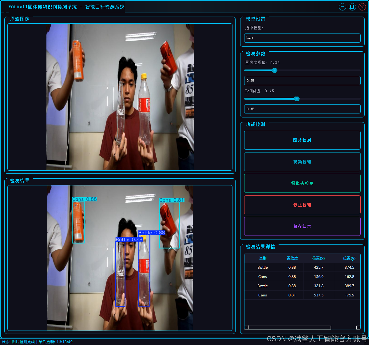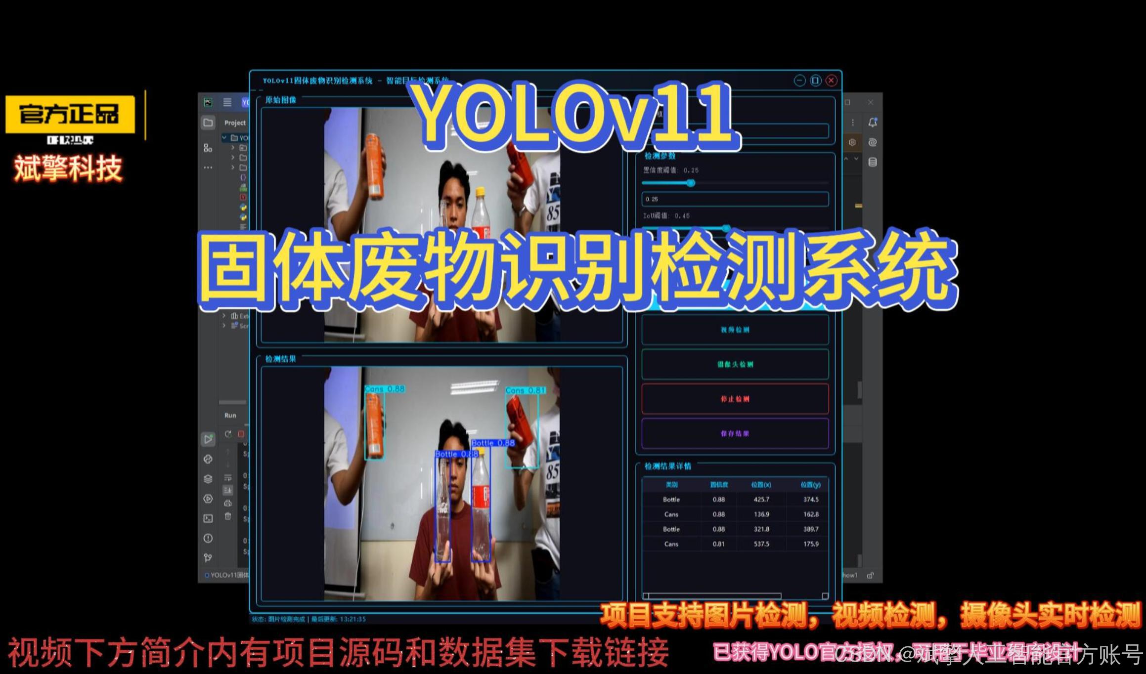 本研究基于先进的YOLOv11目标检测算法,开发了一套高效、准确的固体废物智能识别与检测系统。该系统专门针对可回收物中的两类关键目标——“瓶子”(Bottle)和“罐子”(Cans”)进行优化,旨在为智能垃圾分类、自动化回收分拣等环保应用提供核心技术支持。通过利用深度学习技术,该系统能够实时处理图像或视频流,快速定位并精确分类视野中的废物目标,显著提升了废物分拣的效率和自动化水平,对推动城市固体废物的资源化利用具有重要意义。