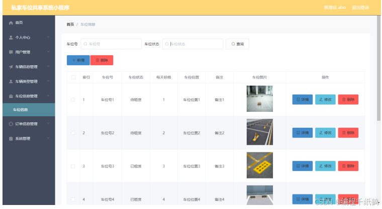 随着信息技术在管理上越来越深入而广泛的应用,管理信息系统的实施在技术上已逐步成熟。本文介绍了私家车位共享系统的开发全过程。通过分析私家车位共享系统管理的不足,创建了一个计算机管理私家车位共享系统的方案。文章介绍了私家车位共享系统的系统分析部分,包括可行性分析等,系统设计部分主要介绍了系统功能设计和数据库设计。本私家车位共享系统有管理员,用户两个角色。管理员可以对用户信息,车辆类型信息进行管理,并且可以审核用户提交的租赁订单,用户可以注册登录,新增车辆信息,查看车位信息并且租赁,并且可以支付。因而具有一定的实用性。本站后台采用Java的SSM框架进行后台管理开发,可以在浏览器上登录进行后台数据方面的管理,MySQL作为本地数据库,微信小程序用到了微信开发者工具,充分保证系统的稳定性。系统具有界面清晰、操作简单,功能齐全的特点,使得私家车位共享系统管理工作系统化、规范化。