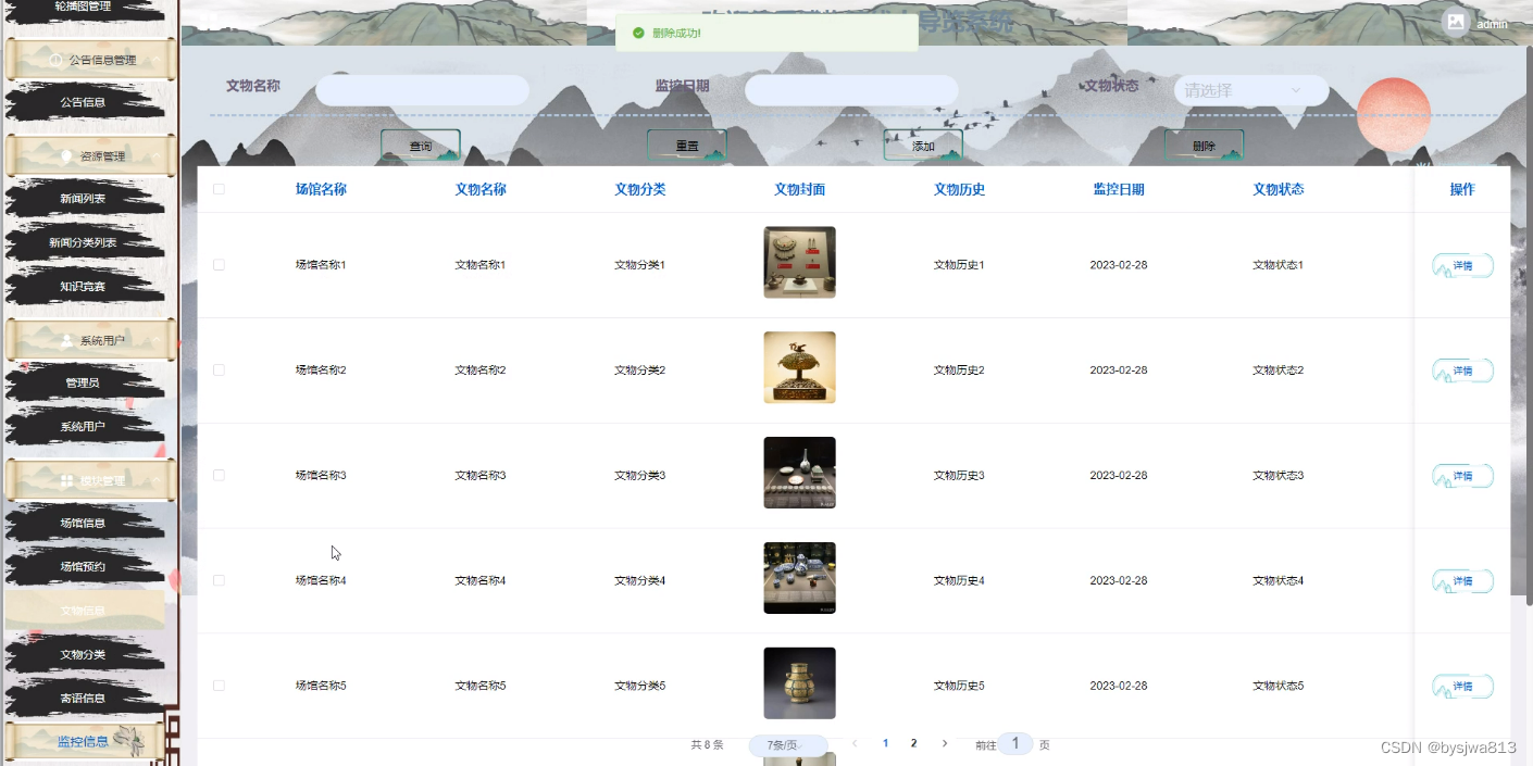 监控信息管理,通过获取索引、场馆名称、文物名称、文物分类、文物封面、文物历史、监控日期、文物状态等信息进行详情、修改或删除等操作,如图5-14所示。