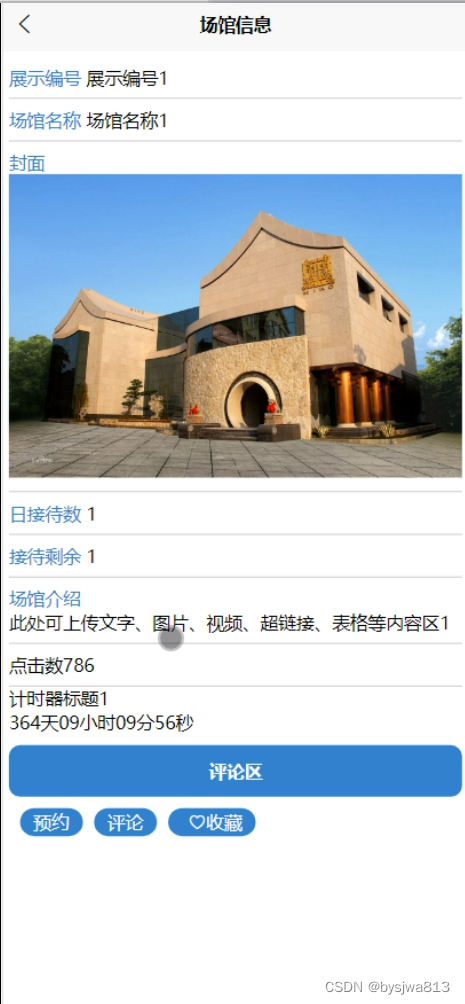 场馆信息信息,在场馆信息页面可以查看展示编号、场馆名称、封面、日接待数、接待剩余、场馆介绍、等信息进行预约、评论或收藏,如图5-4所示。