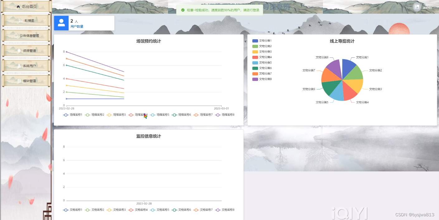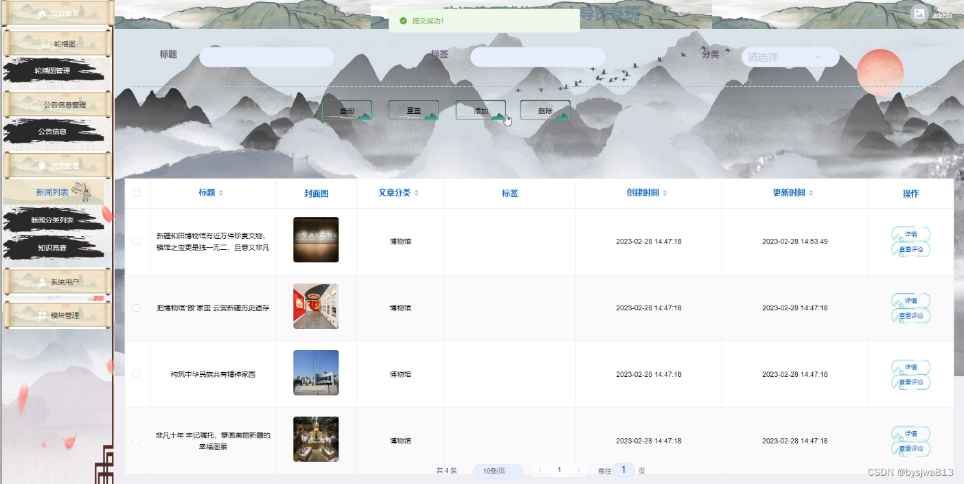 管理员登录进入博物馆线上导览系统 app可以查看首页、轮播图管理(轮播图)、公告信息管理(公告信息)、资源管理(新闻列表、新闻分类列表、知识竞赛)、系统用户(管理员、系统用户)、模块管理(场馆信息、场馆预约、文物信息、文物分类、寄语信息、监控信息)等信息并进行相对应的操作,如图5-8所示。
