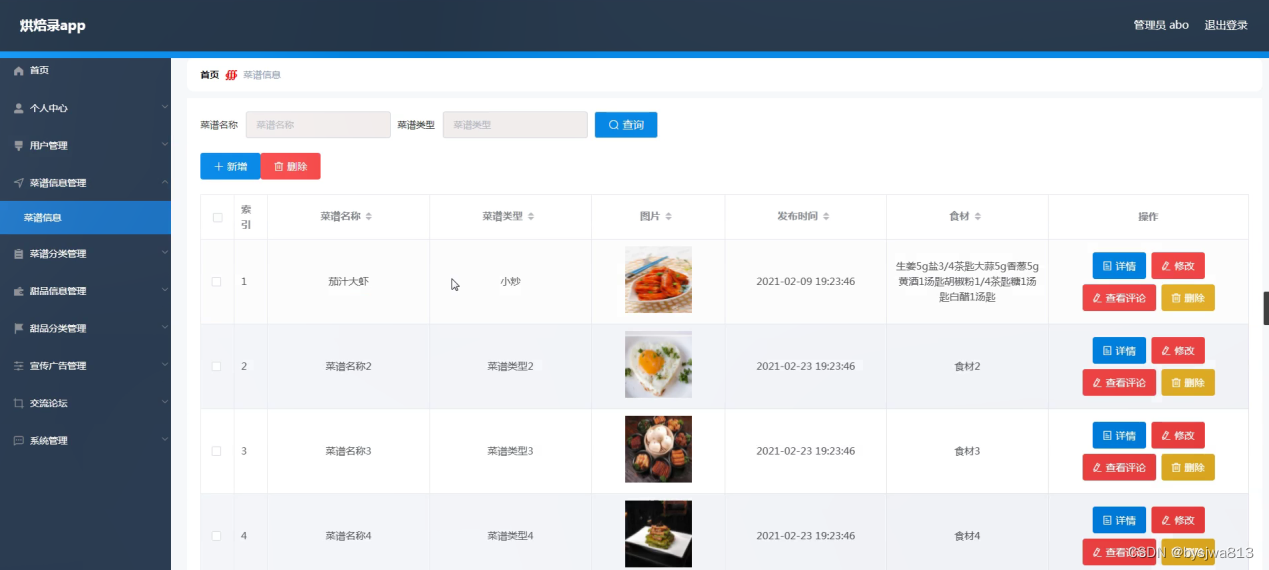 菜谱信息管理,通过获取索引、菜谱名称、菜谱类型、图片、发布时间、食材等信息进行详情、修改、查看评论或删除等操作,如图5-10所示。