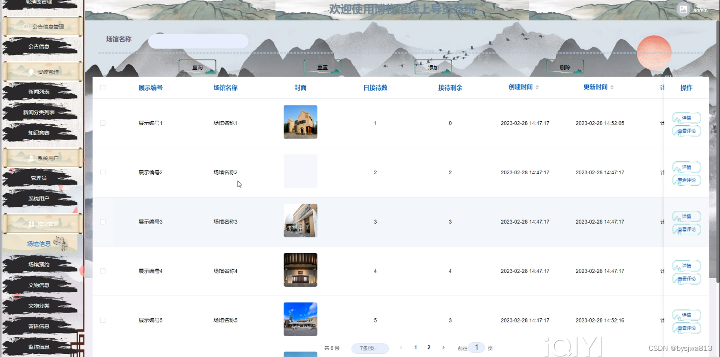 场馆信息管理,通过获取索引、展示编号、场馆名称、封面、日接待数、接待剩余等信息进行查看评论、修改或删除等操作,如图5-13所示。