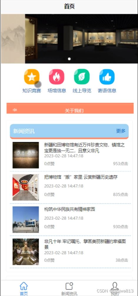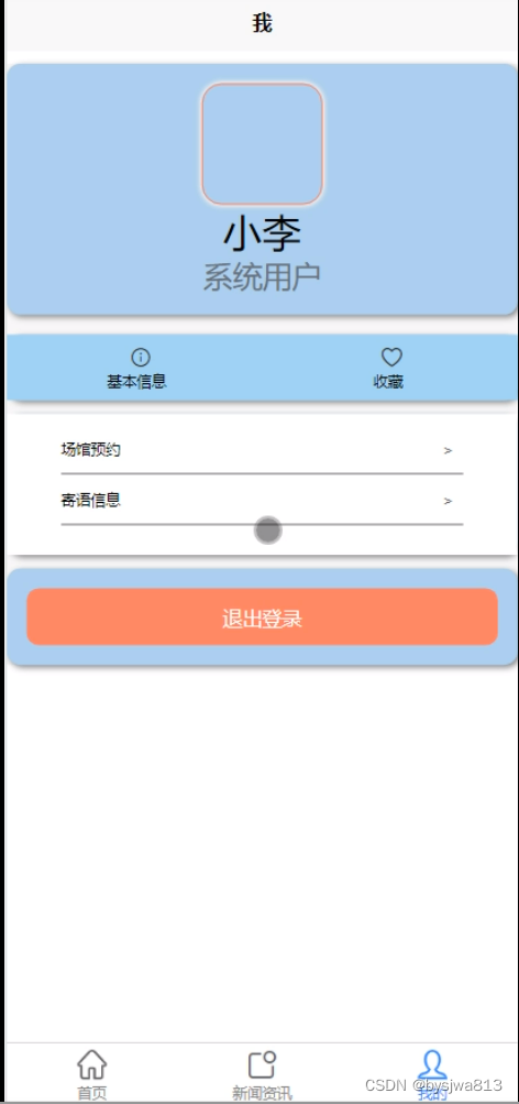 用户登录到博物馆线上导览系统 app可以查看首页、新闻资讯、我的(个人信息、场馆预约、寄语信息、收藏)等内容,如图5-3所示。