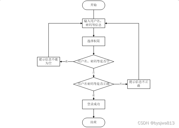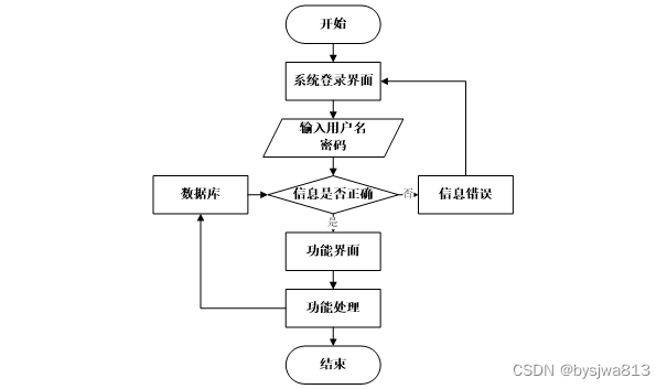 用户打开并进入系统后,会先显示登录界面,输入正确的用户名和密码,系统自动检测信息,若信息无误,则用户会进入系统功能界面,进行操作,否则会提示错误无法登录,操作流程如图3-3所示。