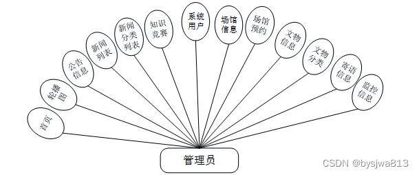 系统中的核心用户是系统管理员,管理员登录后,通过管理员菜单来管理后台系统。主要功能有:首页、轮播图管理(轮播图)、公告信息管理(公告信息)、资源管理(新闻列表、新闻分类列表、知识竞赛)、系统用户(管理员、系统用户)、模块管理(场馆信息、场馆预约、文物信息、文物分类、寄语信息、监控信息)等功能。服务端用例如图3-7所示。