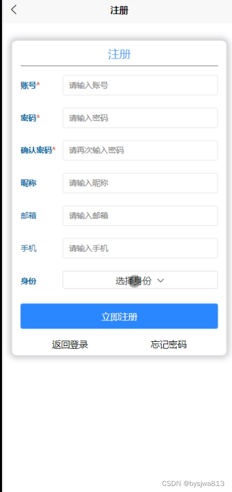 用户注册,在用户注册页面可以填写用户名、密码、姓名、性别、手机、邮箱等信息,进行注册如图5-1所示。