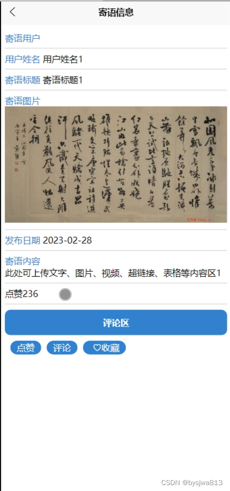 寄语信息,在寄语信息页面可以查看寄语用户、用户姓名、寄语标题、寄语图片、发布日期、寄语内容、等信息进行点赞、评论或收藏,如图5-5所示。