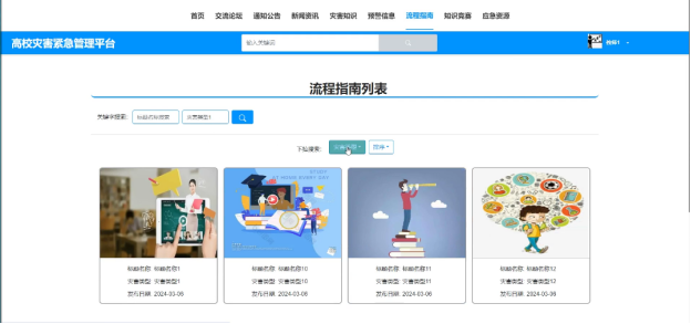 - 流程指南:可查看管理员发布的所有流程指南信息,支持关键字(标题名称、灾害类型)搜索和下拉(灾害类型、排序)搜索,点击可查看详情,进行点赞、收藏和评论。