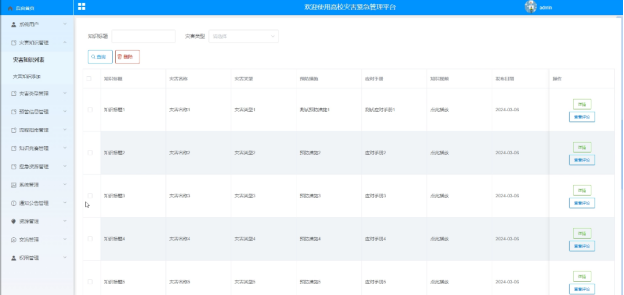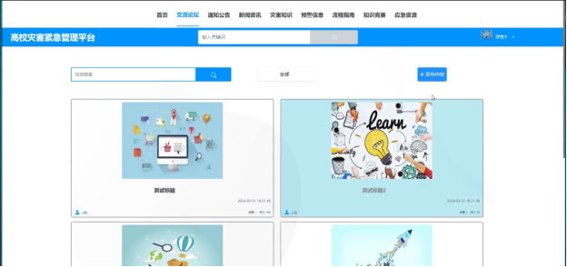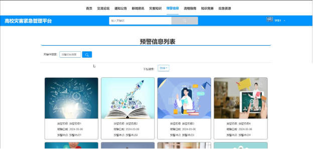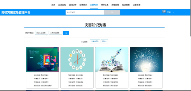 The development of a disaster emergency management platform in universities allows students and teachers to quickly access the latest information and comprehensive disaster knowledge, warning information, process guidelines, and other disaster emergency information at any time, so that they can quickly take corresponding response and emergency measures, reduce losses and injuries caused by accidents; And enhance information exchange and sharing, enhance user interaction, and enhance user experience. At the same time, provide administrators with a tool for emergency management of university disasters, and improve the efficiency of university disaster emergency management.