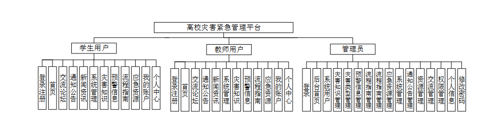 根据用户对系统的需求,要求系统简单操作,能够准确、安全和完整的对信息进行管理。对高校灾害紧急管理平台做需求做解析后,该系统主要分为学生用户、教师用户和管理员三大模块。