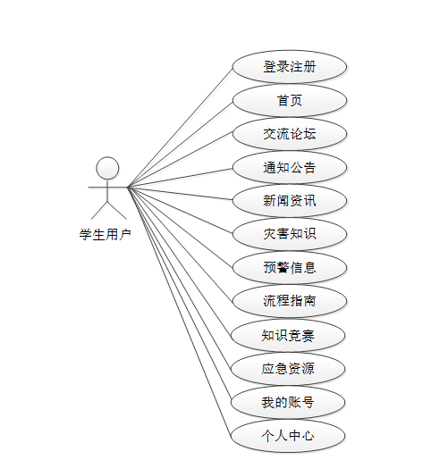 对高校灾害紧急管理平台做需求做解析后,该系统主要分为学生用户、教师用户和管理员三大模块。该系统的用户角色用例图分别是图2-1、图2-2和图2-3。