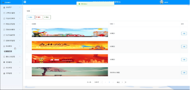 - 系统管理:可对首页的轮播图进行管理,进行增删改查操作,支持标题搜索,可点击查看详情。
