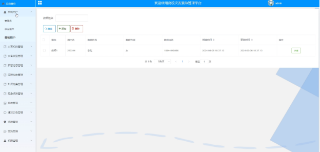 可对学生用户、教师用户和管理员进行管控,包括进行增删改查操作,点击可查看详情。界面如下图所示。