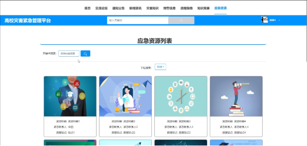 可查看管理员发布的所有应急资源信息,支持关键字(资源标题)搜索和下拉(排序)搜索,点击可查看详情,进行点赞、收藏和评论。界面如下图所示。