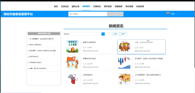 - 灾害知识:可查看管理员发布的所有灾害知识信息,支持关键字(知识标题、灾害类型)搜索和下拉(灾害类型、排序)搜索,点击可查看详情,进行点赞、收藏和评论。