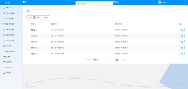 - 通知公告管理:可对通知公告进行管理,进行增删改查操作,支持标题搜索,可点击查看详情。