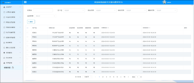 - 权限管理:可对用户组的权限进行管理,进行增删改查操作,支持权限名、用户组、添加权限、修改权限、删除权限、查询权限搜索,可点击修改(添加、修改、删除、查询)操作。