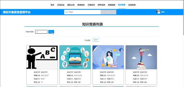可查看管理员发布的所有知识竞赛信息,支持关键字(竞赛名称)搜索和下拉(排序)搜索,点击可查看详情,进行点赞、收藏和评论。界面如下图4-9所示。