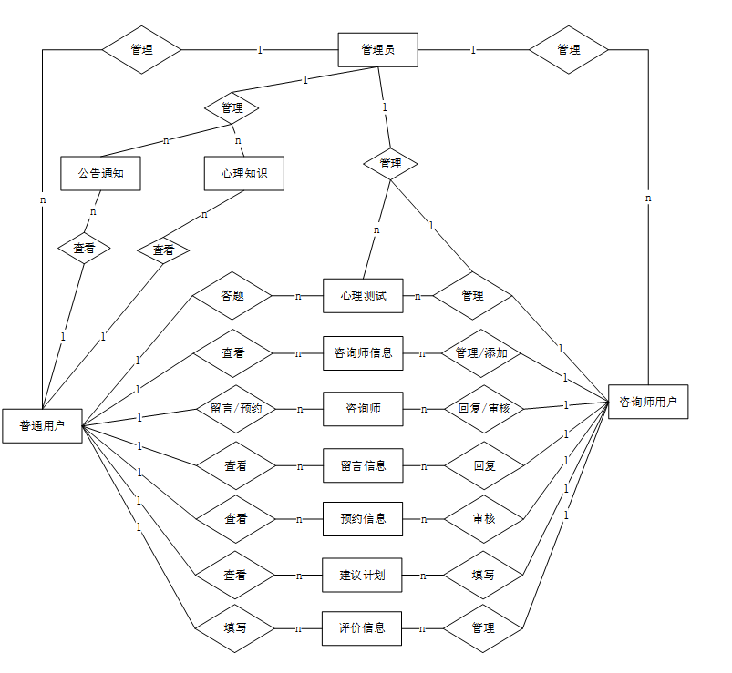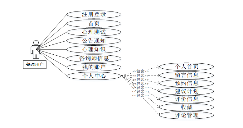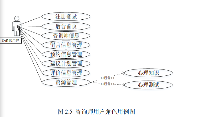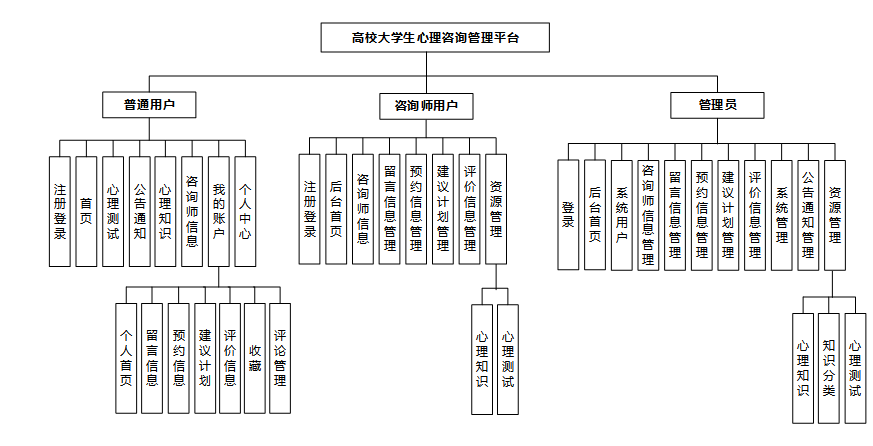 大学生心理咨询管理平台的设计在功能上划分为普通用户、咨询师用户和管理员三种角色。
