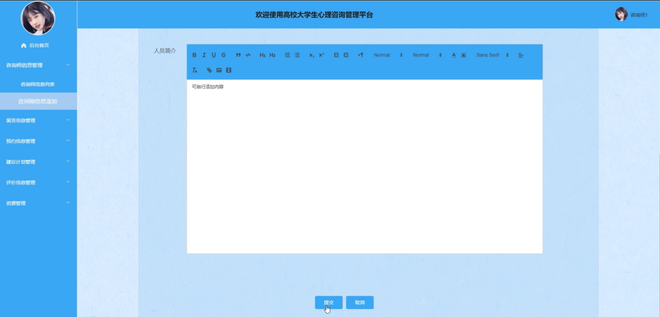 后台首页:咨询师可以在此修改个人资料和登录密码,确保个人信息的安全和更新。