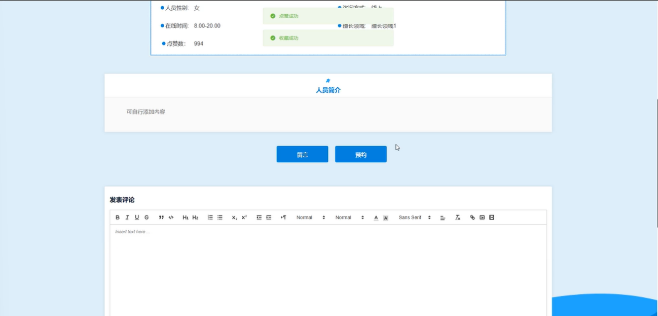 咨询师信息:用户能够查看各咨询师的详细信息列表,如人员姓名、性别、咨询方式等,并根据个人需求输入人员姓名或选择咨询方式进行搜索和排序。此外,还能对咨询师进行点赞、收藏、评论回复删除以及留言预约。