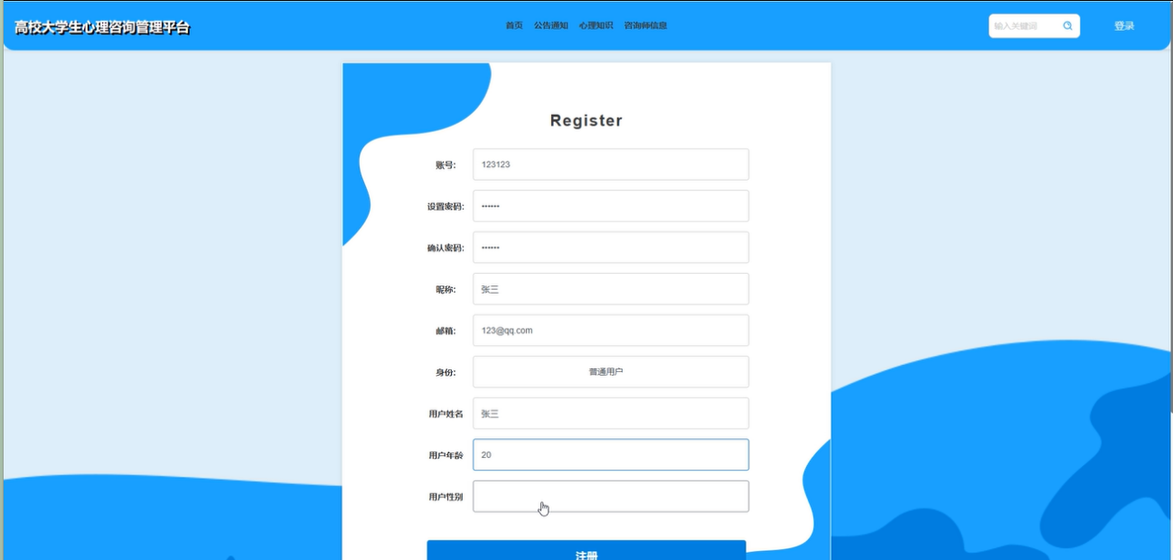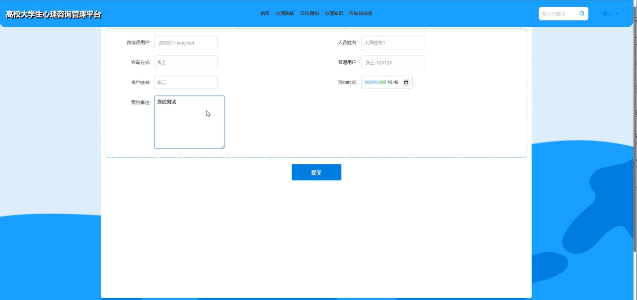 平台设计简洁、操作友好,用户可以轻松管理个人信息并享受专业的心理健康服务。管理员和咨询师能够高效处理预约、留言、心理测试等信息,提高了系统的管理效率。