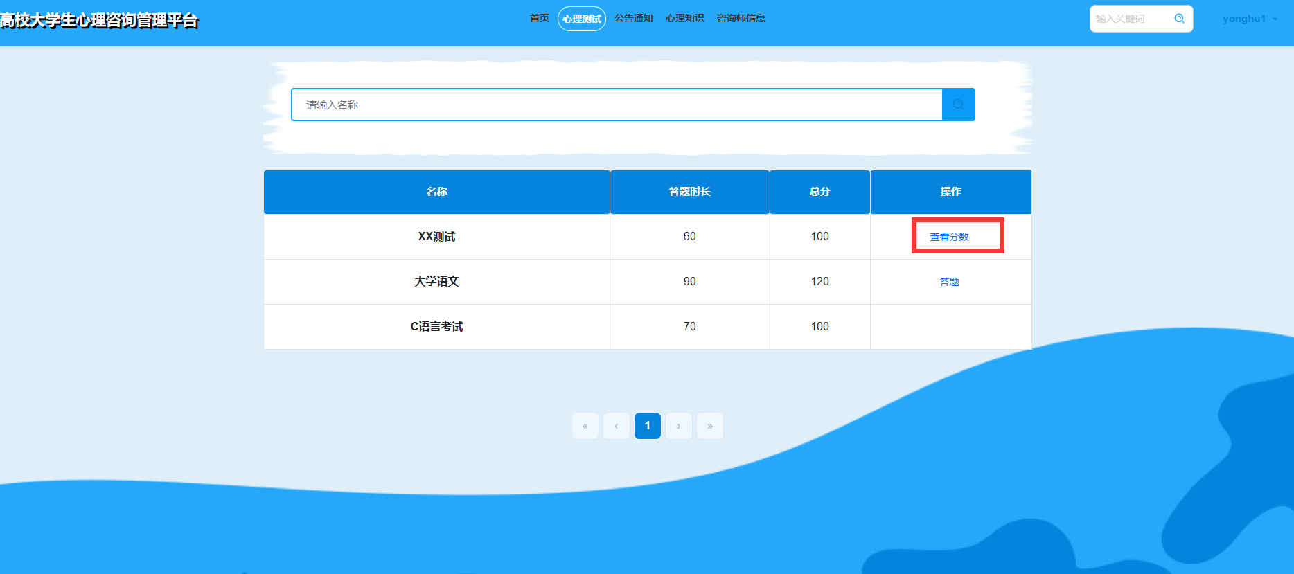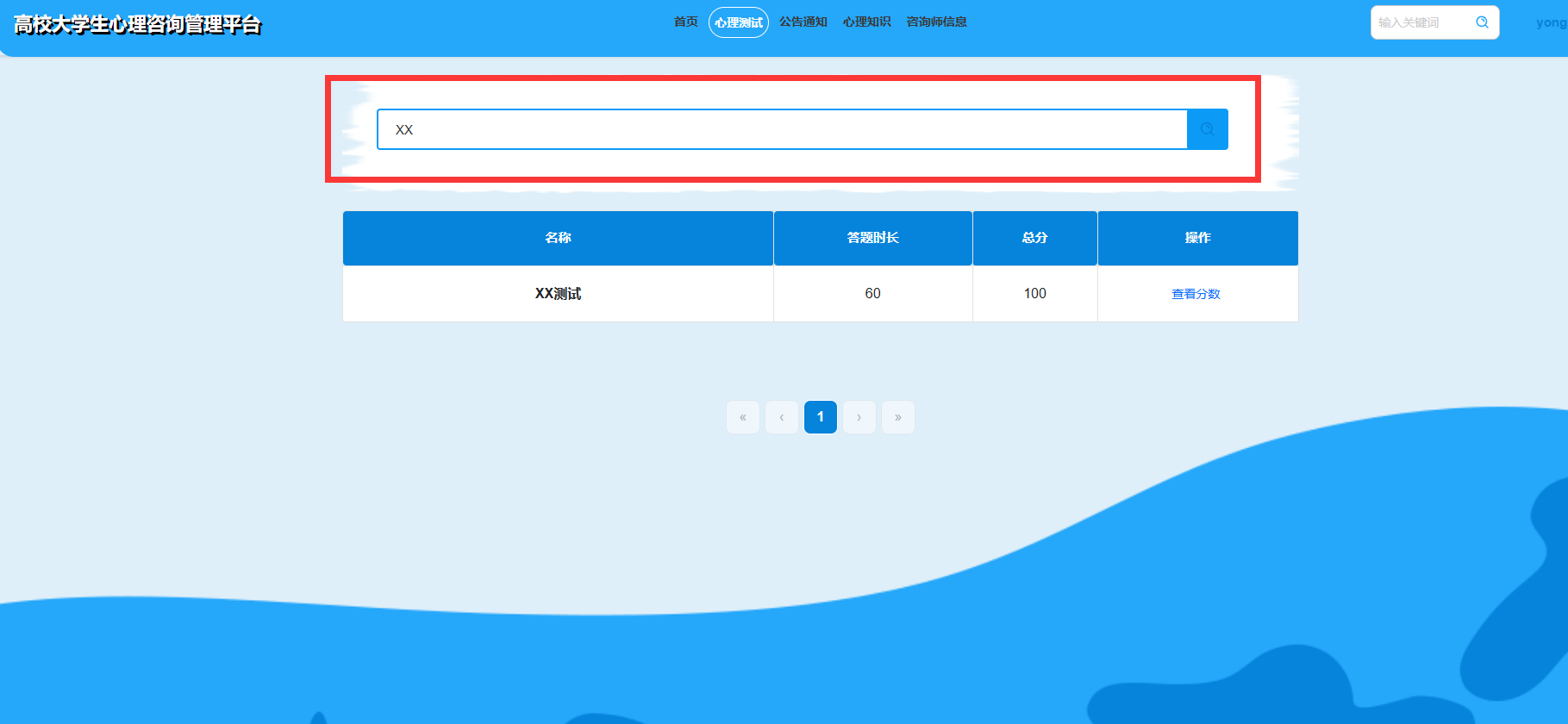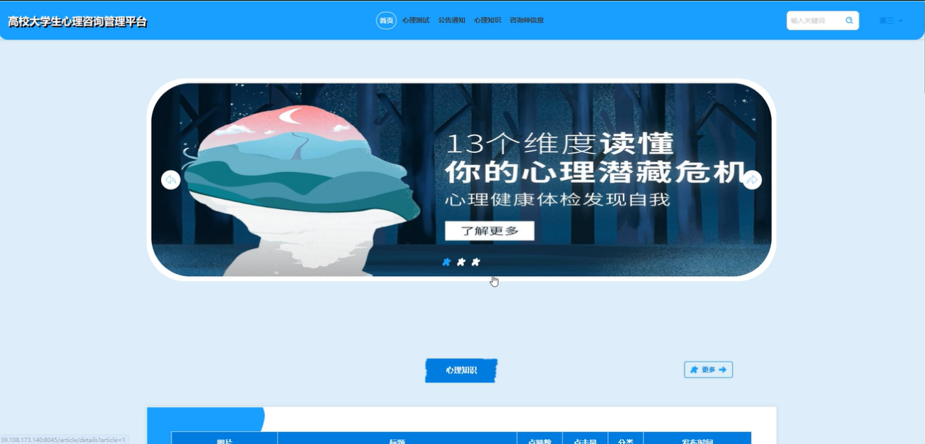 首页:普通用户可以在首页查看并操作导航栏,浏览轮播图、心理知识、公告通知和咨询师信息等内容。通过输入关键词进行全网搜索。