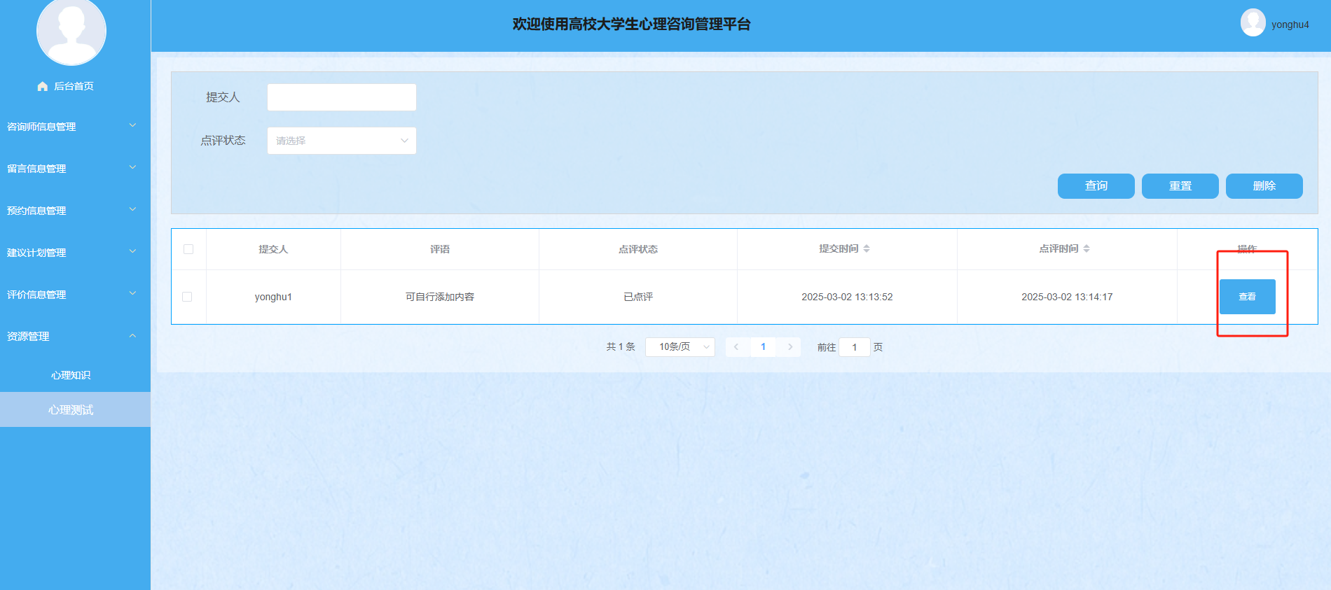 评价信息管理:咨询师可以查看用户的评价信息详情,通过输入人员姓名等条件进行搜索、查询和重置操作。