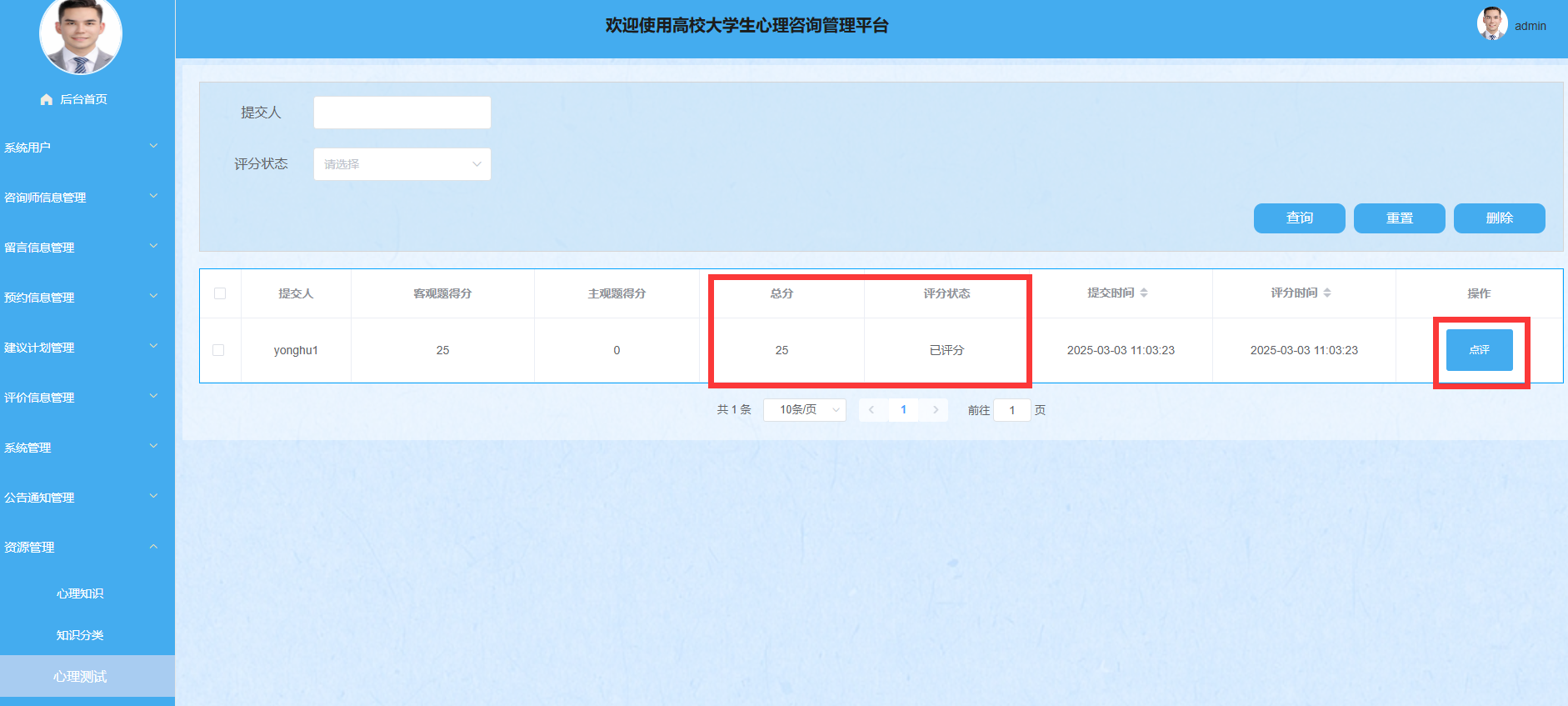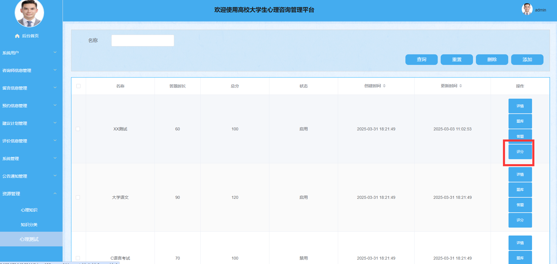 图4.13 资源管理-心理测试界面图