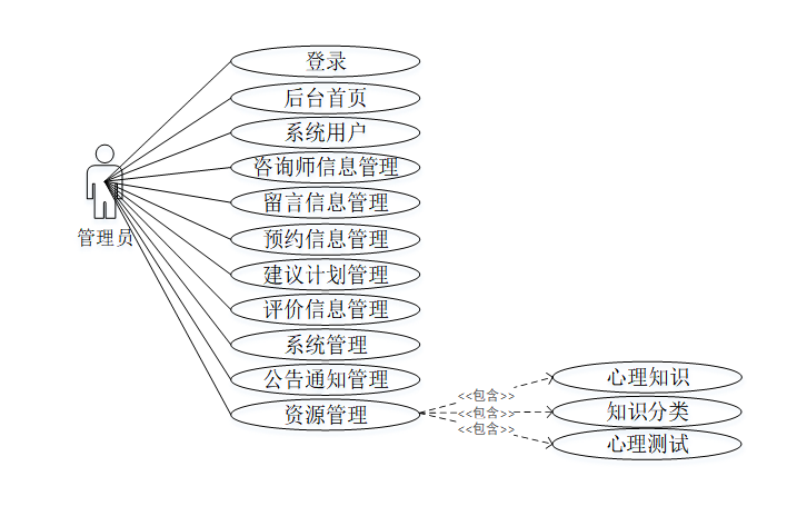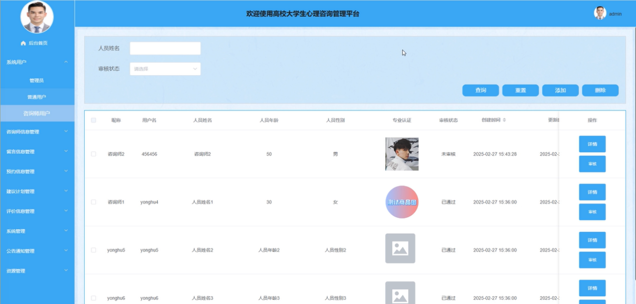 系统用户:管理员负责管理所有用户的账号详情,包括学生用户和咨询师用户,通过输入人员姓名等条件进行搜索、增删改查操作,并对咨询师账号进行审核。