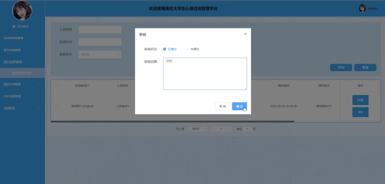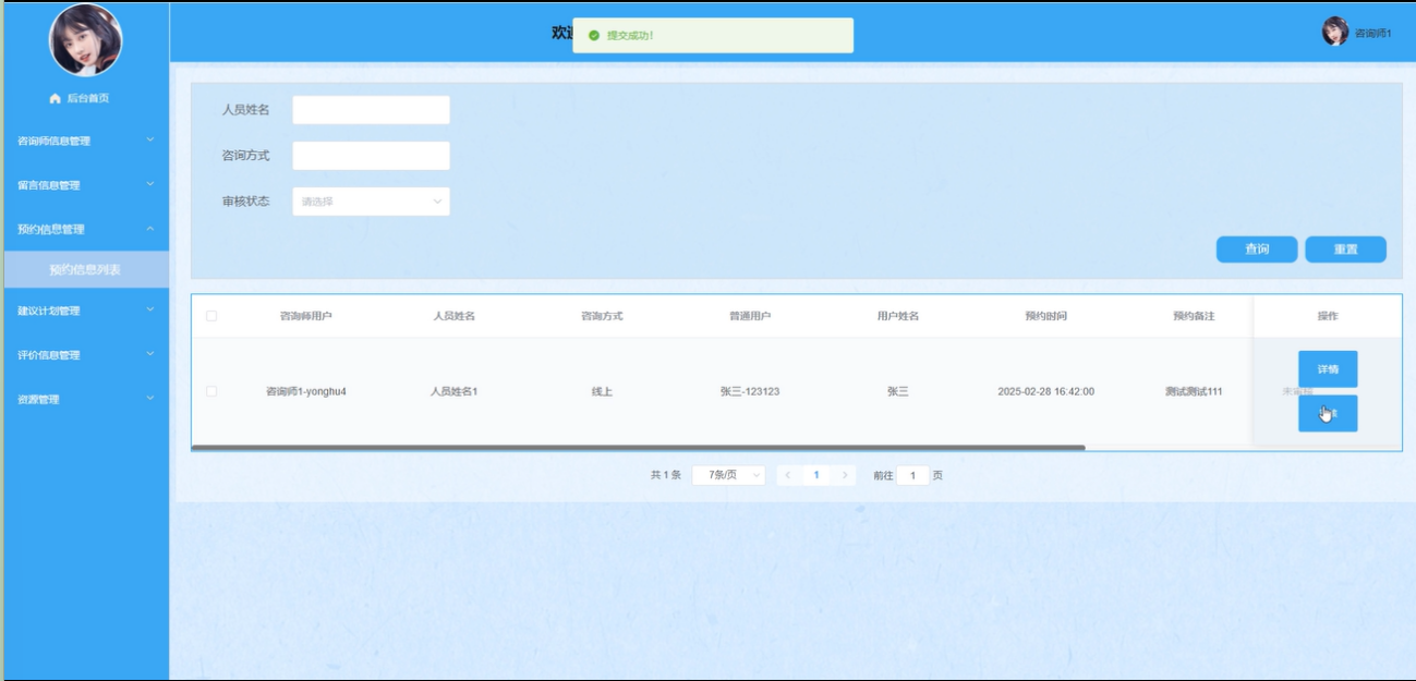 预约信息管理:咨询师可以查看用户的预约详情,通过输入人员姓名等条件进行搜索、查询、重置操作,审核预约请求后记录日期并填写给用户的建议内容。