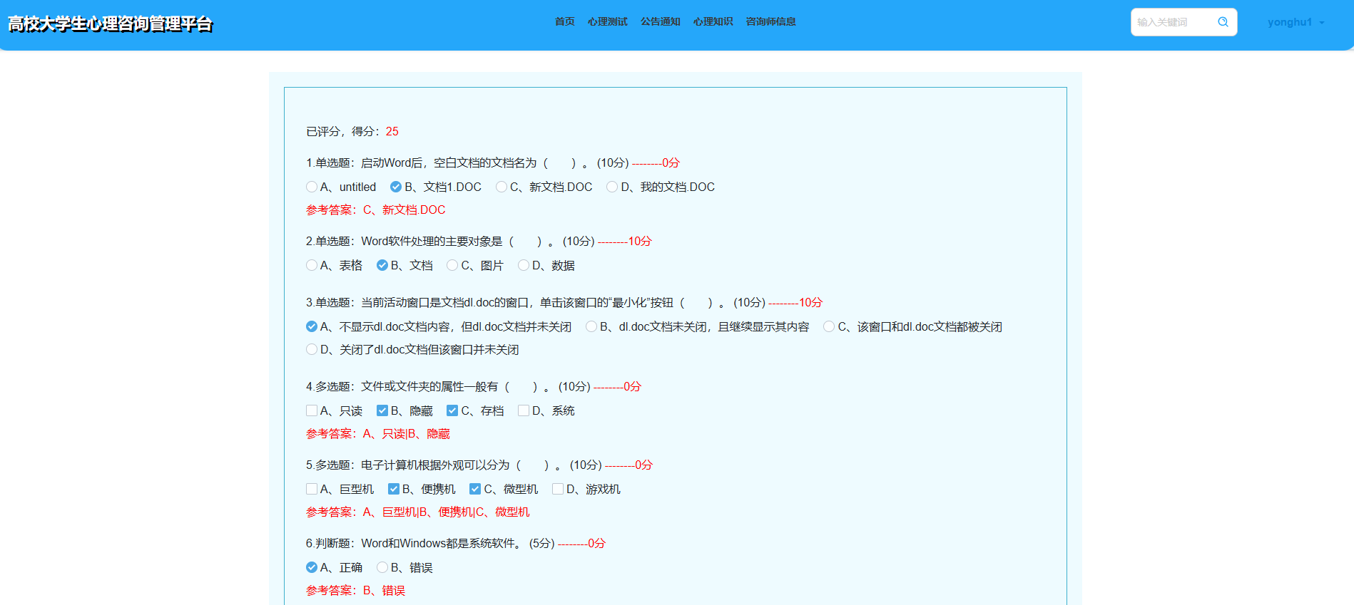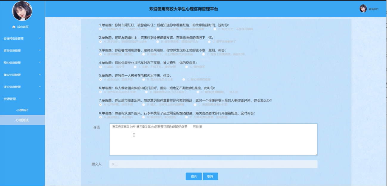 用户可以参与多种类型的心理测试,包括单选题、多选题和判断题等自动评分类型的题目,主观题则由咨询师评分。完成答题后,系统会自动计算分数并显示结果,同时用户提交的答卷可供咨询师查看并填写评语。界面图如下。